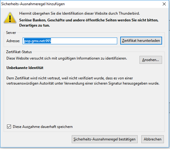 Thunderbird Akzeptiert Gmx Zertifikat Nicht Konten Einrichten Thunderbird Mail De